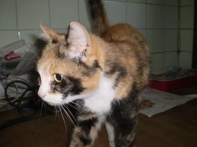 Сейчас находится на передержке. Уж не знаю что с ней делали бывшие хозы, но сейчас кошка отъедается и приходит в себя.