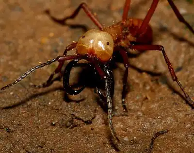 Теперь вас не удивит тот факт, что, во-первых, эти муравьи огромны — с солдатами, достигающими полутора сантиметров в длину, во-вторых, у них есть массивные, мощные мачетоподобные жала размером в половину тела. Известны они прежде всего тем, что разбирают на винтики всё живое, что встретится им на пути вне зависимости от размера. Также они совершенно слепые, что делает общую картину определенно хуже.