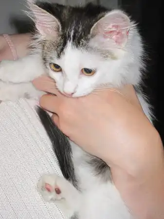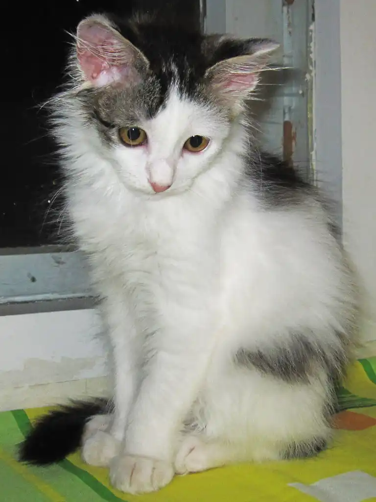 Окрас бело-серый, пушистая, возраст примерно 2 месяца. По характеру она ласковая, мурчит как тракторёнок, очень весёлая и игривая.