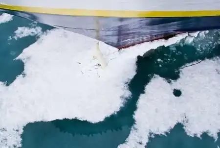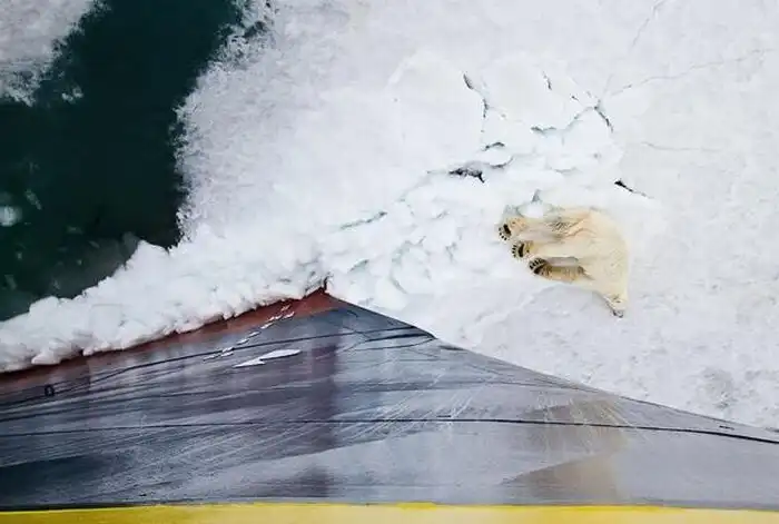 Медведица подплыла к судну и стала показывать различные акробатические номера.---