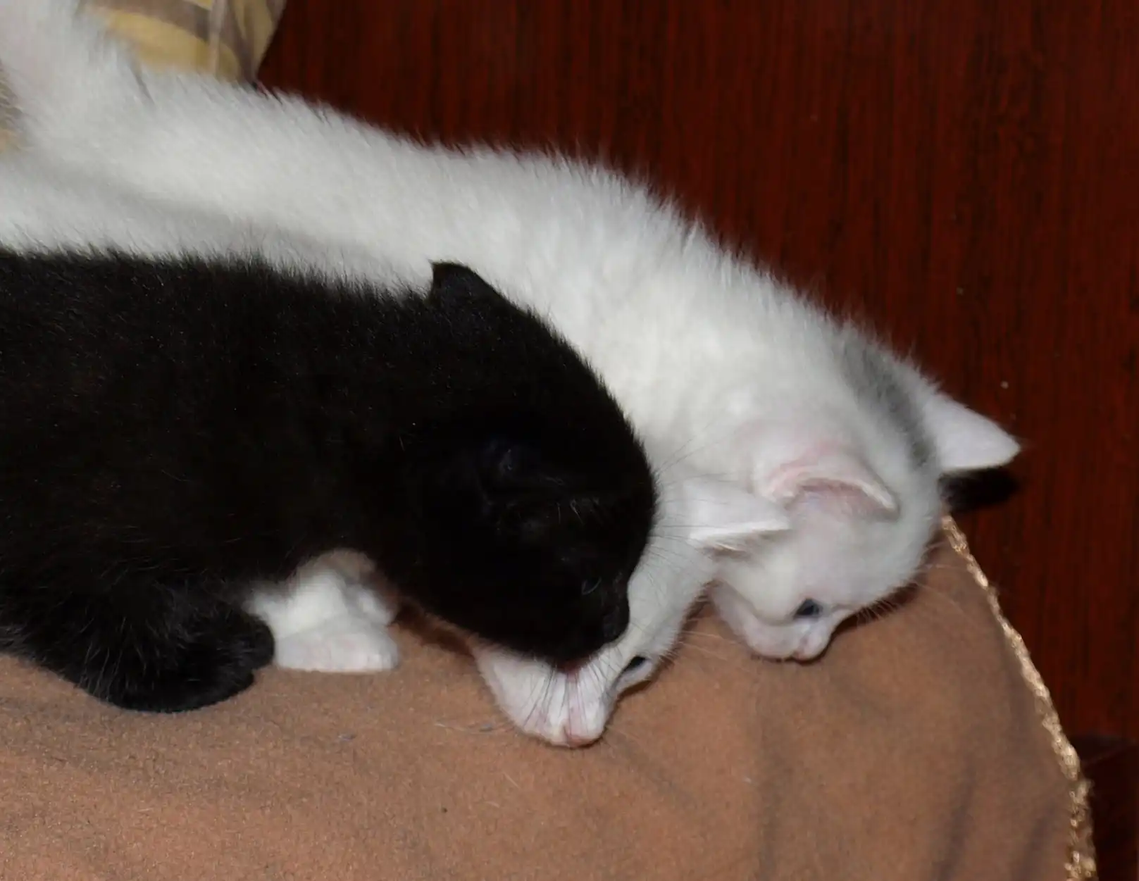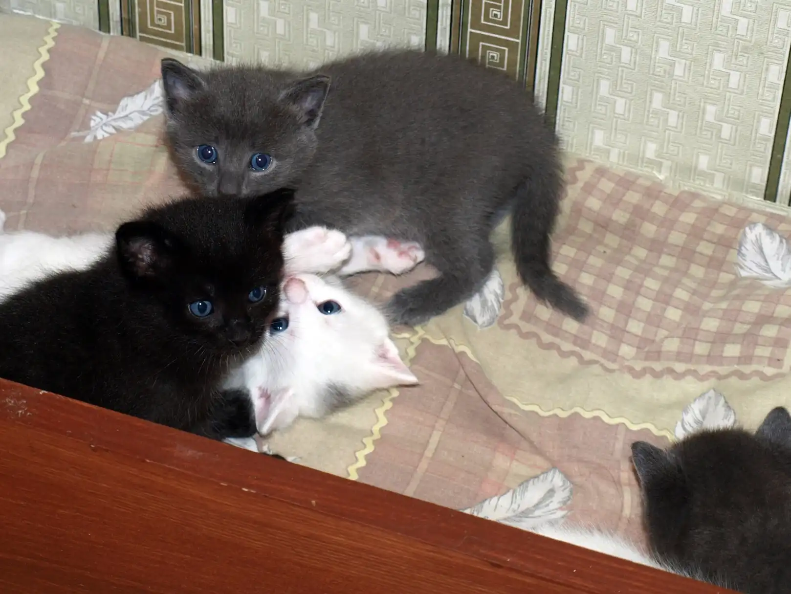 Пятеро котят: 2 беленьких, 2 сереньких и один чёрненький, ищут своих любящих хозяев.