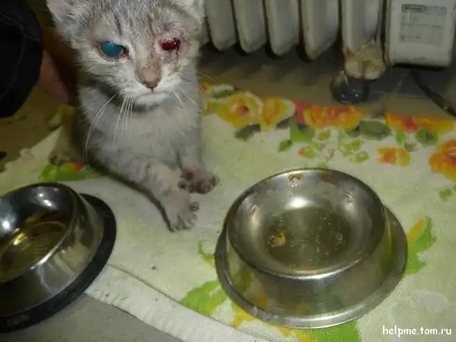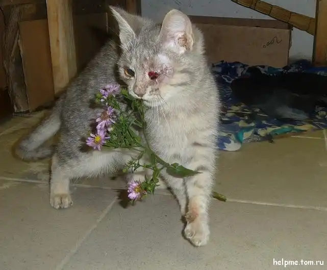 В субботу около клиники появилась женщина с котенком на руках, заглянула и вышла. Сначала на это не обратили внимания…но позже снаружи клиники врачи увидели того самого котенка. Совсем одного… и с глазиком наружу… Малышу сделали операцию в этот же день. Отличный котик (мальчик), ласковый очень. Не хочет оставаться один совсем… лезет на ручки, мяукает…зовет так, что немного уже охрип… Взяла ему цветочек, чтобы поиграть – он немного повеселился и принес мне его обратно… Очень уж ему снова хотелось на ручки. Малыш активный, игривый, веселый, очень душевный. У него очень красивая мордашка, добрая. Он не держит ни на кого обиды. Он живет настоящим моментом и сейчас ему больше всего хочется домой. Ч/з 10 дней (21. 09), когда снимут шов – он будет полностью готов к переезду к самому дорогому человеку на свете.