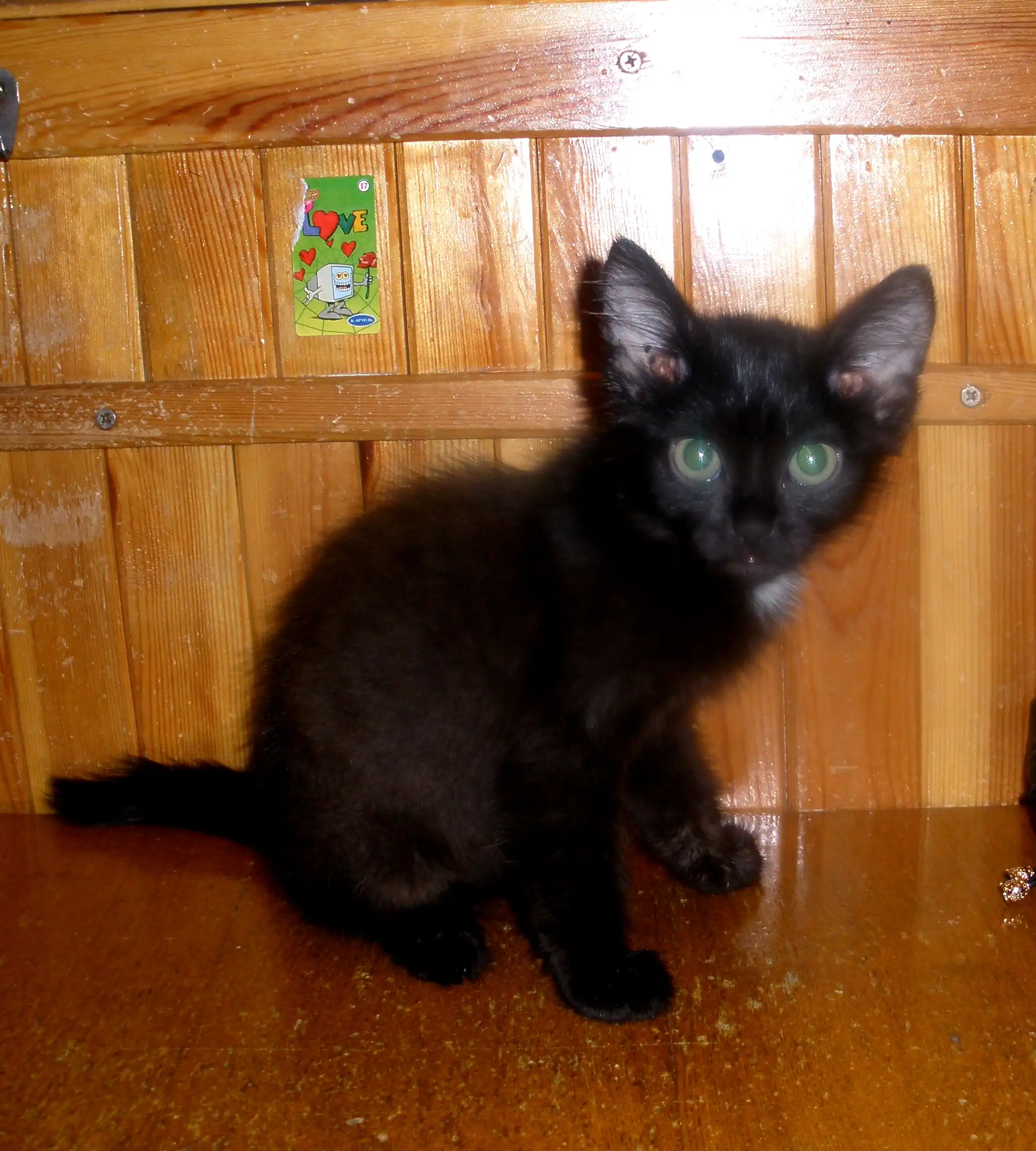 Найден сегодня в районе Комсомольского. Очень ласковый зверек - мальчик. Черненький с белым треугольничком на грудке. Помыт и обработан от блошек, почищенны ушки.