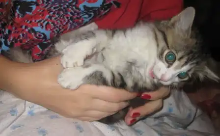 Феня была подкинута в подъезд жилого дома. У нее обстрижены (именно обстрижены, потому, что очень ровно сделано) усы на правой стороне мордочки, но это ее не портит=)