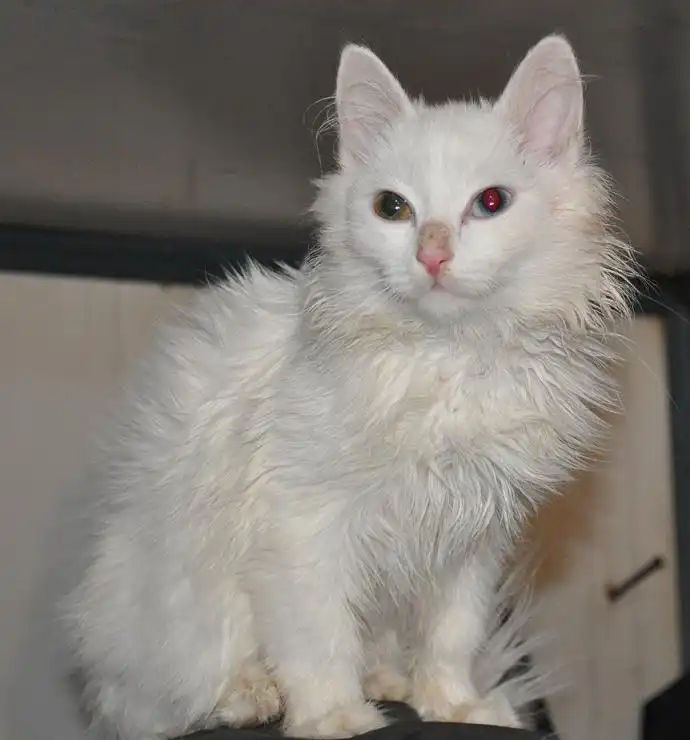 Очаровательная пушистая блондинка с разными по цвету глазами (правый-зелёный, левый - голубой), в возрасте примерно 4 месяца ищет свой дом и любящих хозяев. Кошечка подброшена на склады, в такие морозы ей на улице не выжить, приютили, отогрели, накормили. Активно ищем для неё дом. Вырастет красивой, пушистой кошечкой (чем-то похожа на ангорскую, не глухая). Имеет редкое природное явление, разные по цвету глазки, один ярко голубой, второй орехово-зелёный. Очень ласковая, контактная. Собак не боится (ест с ними из одной миски).