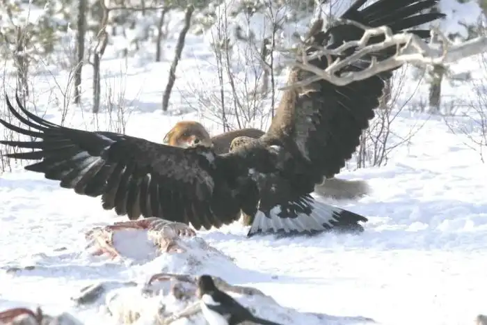 орел потыкал лиса, носом в мясо! С тех пор он больше так не делал