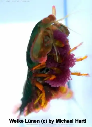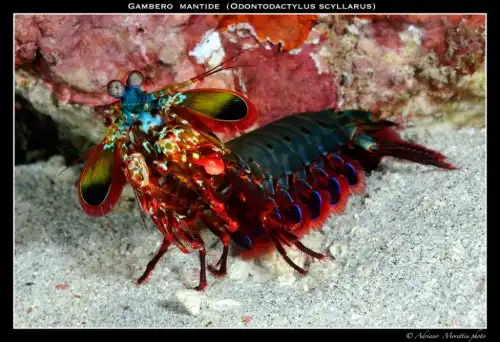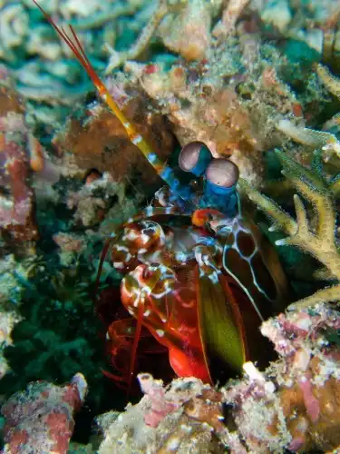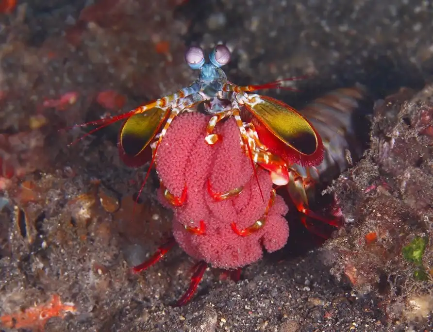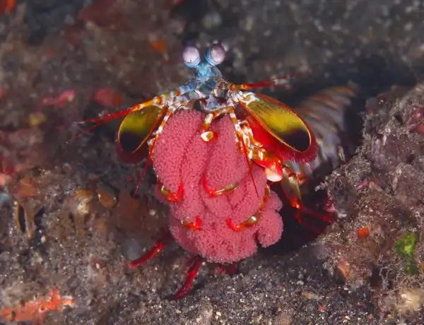 Самцы креветки-богомола обладают очень яркой внешностью. В глазах рябит от такого многообразия красок. Кроме того, эти креветки имеют уникальное зрение, которое позволяет им видеть предметы практически во всех диапазонах спектра. И еще, у них самое сложное строение глаз среди всех животных нашей планеты.