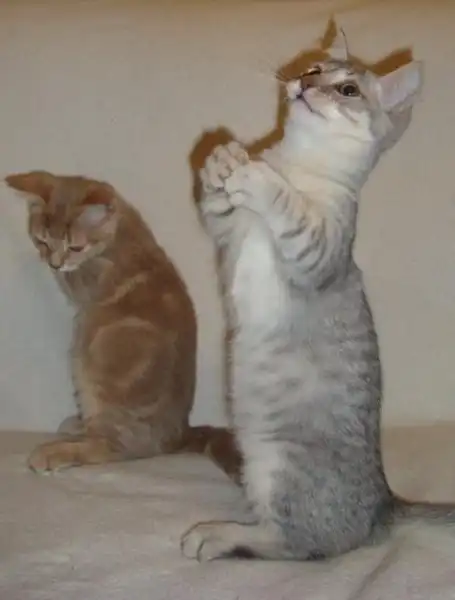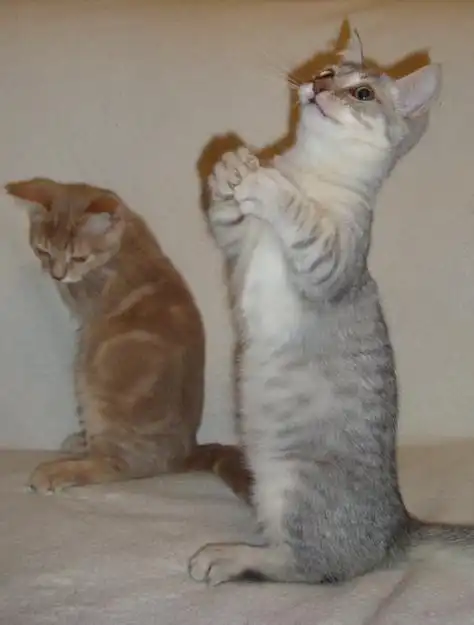 Манчкины — очень необычные кошки. При средней длине тела их лапки короче, чем у обычных кошек в 2-3 раза, из-за этой особенности их иногда называют кошки-таксы. Но внешним видом странности не ограничиваются. Тогда как обычные кошки, чтобы осмотреться, встают на задние лапки, манчкин садится на бедра и крепко упирается хвостом. В таком положении кошки могут находиться в течение довольно продолжительного времени, а свисающие по бокам коротенькие лапки придают сходство с кенгуру, что выглядит очень комично.