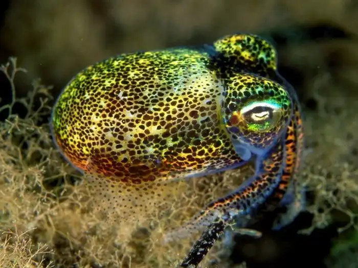 Приседающий омар поражает воображение яркостью своих красок – насыщенные оттенки розового, с фиолетово-пурпурными пятнами и желтыми волосками украшают тело, вырастающее всего до 1,4 сантиметра в длину.