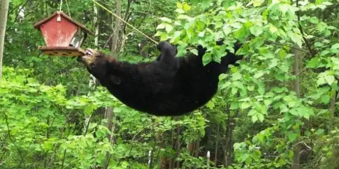 Не легкая жизнь у этого медведя, это надо так оголодать, чтобы начать охотиться на птиц. Очень тяжело пришлось мишке, скворечник висел высоко на веревке, пришлось применить акробатические трюки.