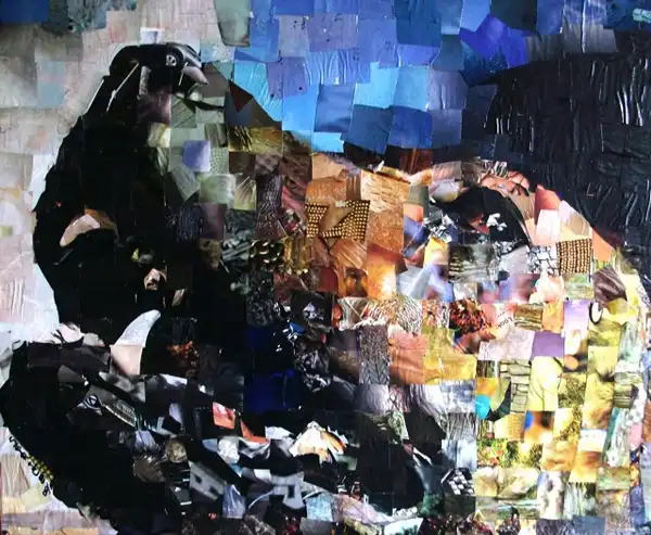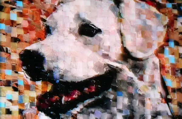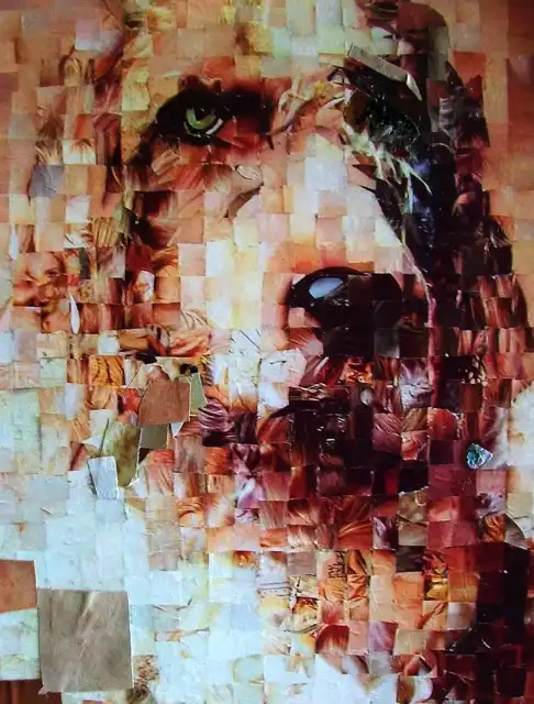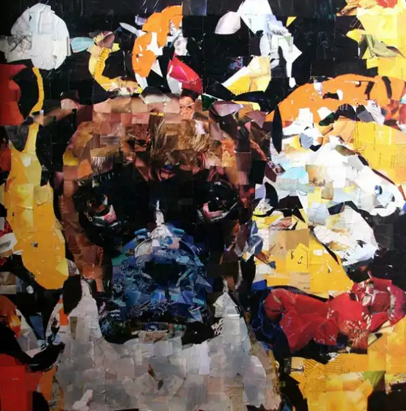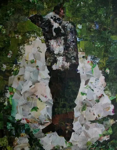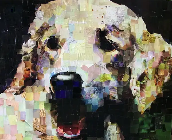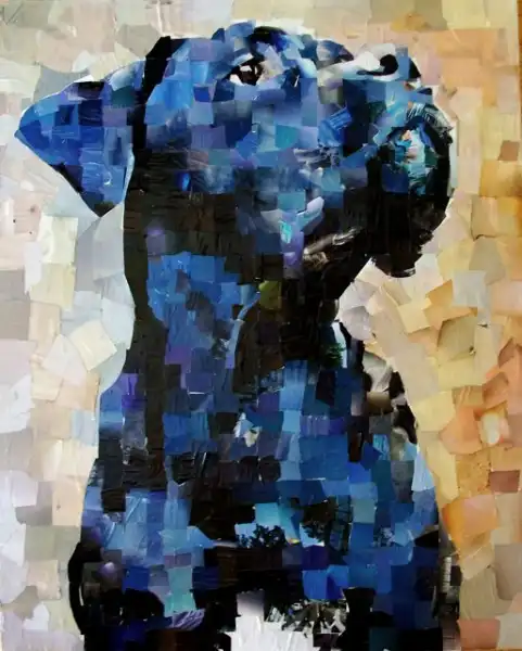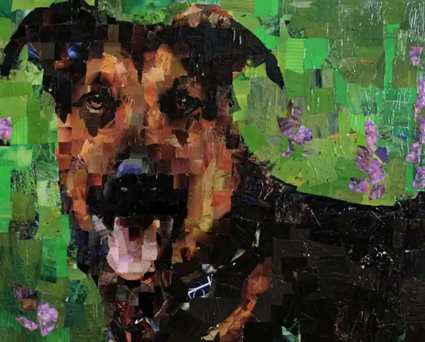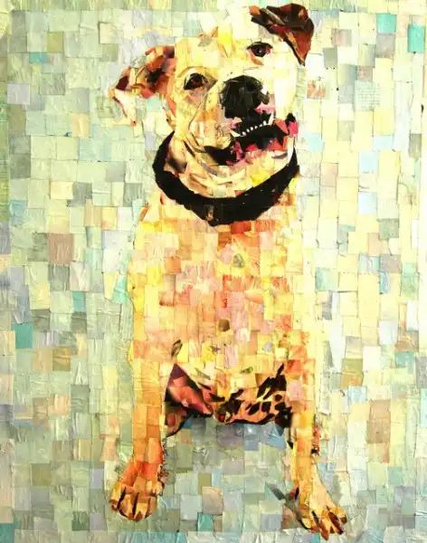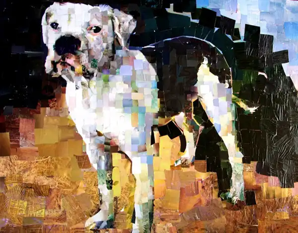 Для этого Прайс собирает стопку старой печатной периодики, пролистывает их и вырезает ножницами квадратики нужного для картины цвета. Потом он наклеивает эти небольшие элементы на холст и получает портреты-коллажи, из которых на него смотрят добрые-добрые морды главных четвероногих любимцев Человечества.