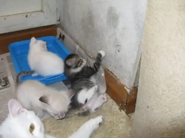 19 марта у белоснежной красавицы родились котята. Видимо их рождение не входило в планы хозяев кошки и её с малышами просто выкинули на улицу. Котята и кошка были обречены на гибель, если бы их не спасла услышавшая писк женщина. Котятам скоро исполнится месяц и через некоторое время они уже смогут украсить ваш дом своим присутствием и добавят в него чуточку тепла.