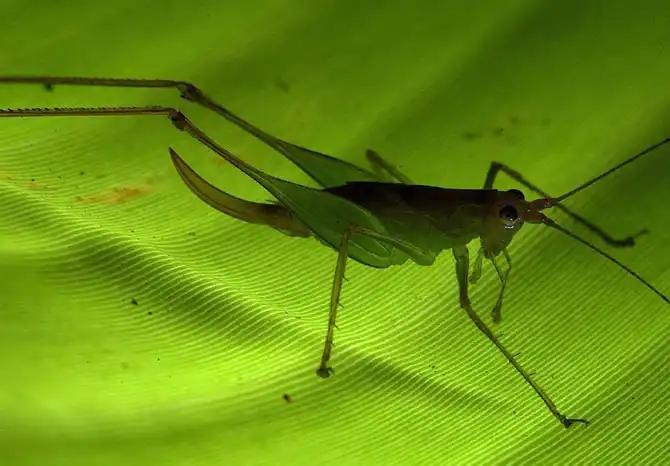 Этот павлиноподобный кузнечик был обнаружен во время экспедиции 2006 года в горы Гайаны Акараи. Это большое насекомое из тропических лесов использует две эффективных стратегии, чтобы защитить себя: во-первых, оно выглядит как опавший лист, а если ему грозит опасность, оно поднимает пару крыльев с узором в виде глаз и начинает прыгать таким образом, чтобы его противник принял его за голову гигантской птицы.
