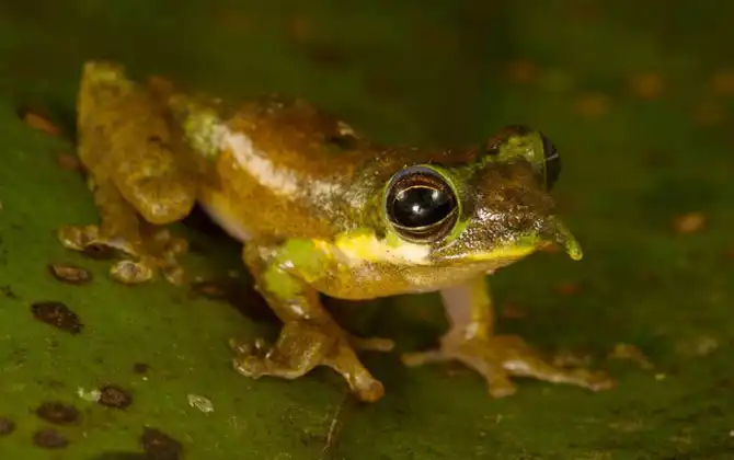 Эта древесная лягушка с огромными глазами, длиной в 6 дюймов, была обнаружена возле горной реки во время экспедиции ПАБ по горной пустыне в Папуа – Новой Гвинее в 2008 году. Она принадлежит к группе лягушек с необычным веноподобным узором на веках.