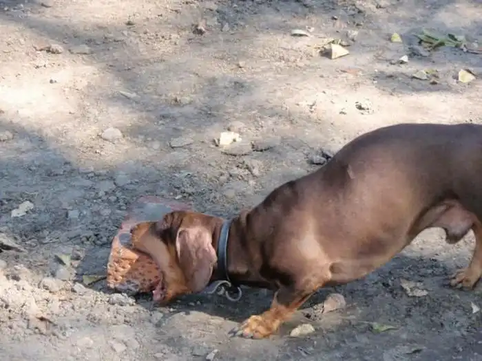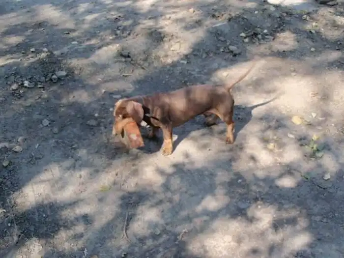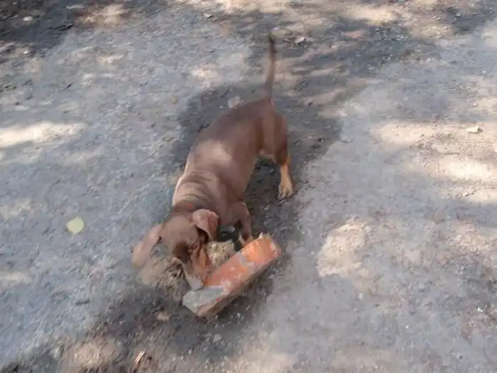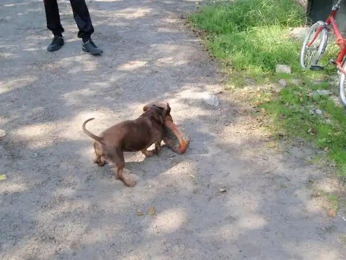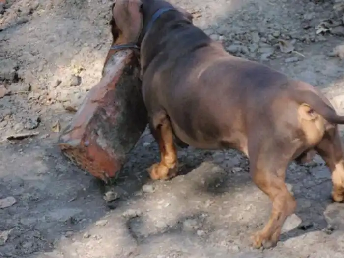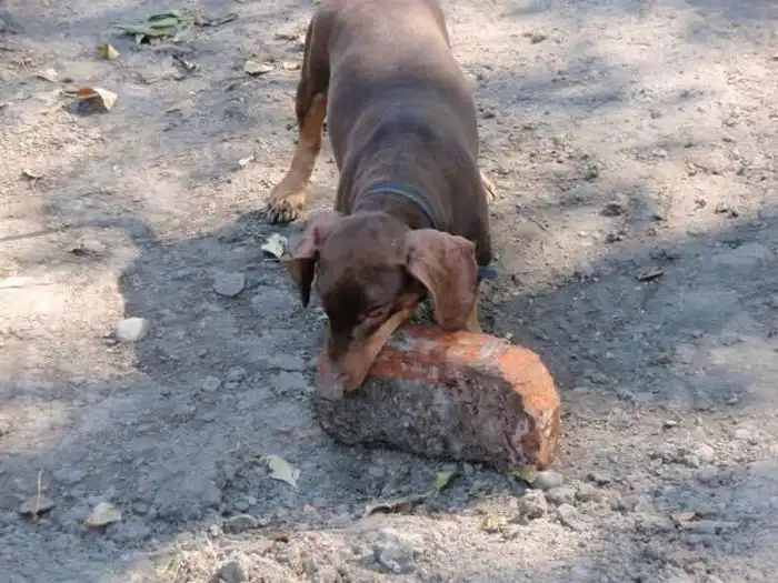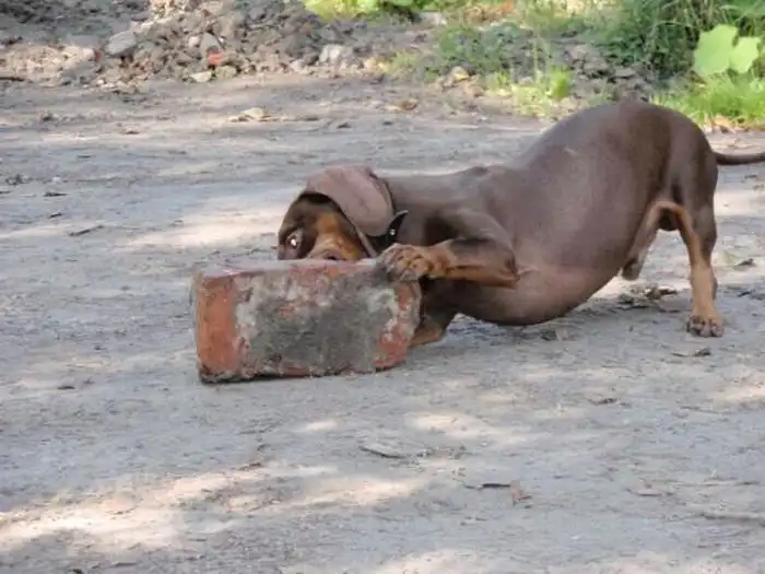 Никогда не видел, чтобы собаки игрались с кирпичами, а эта такса, видимо и не подозревает, что существуют мягкие игрушки или что-то в этом роде.