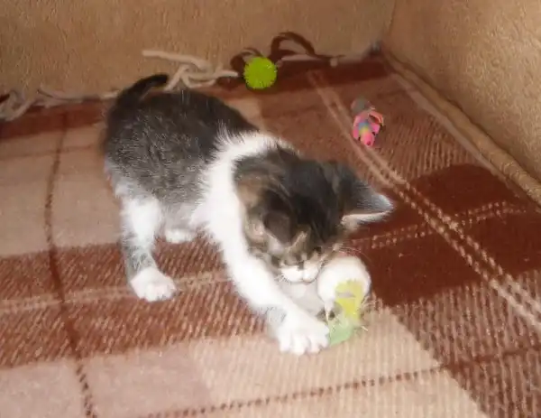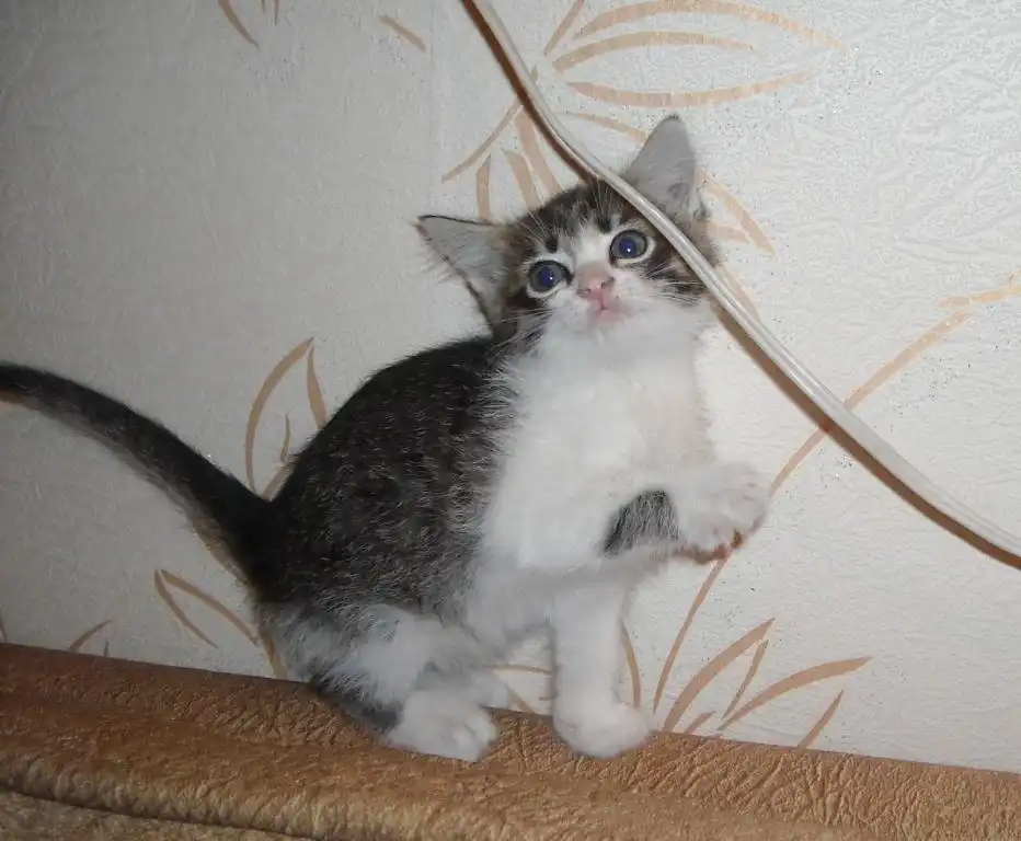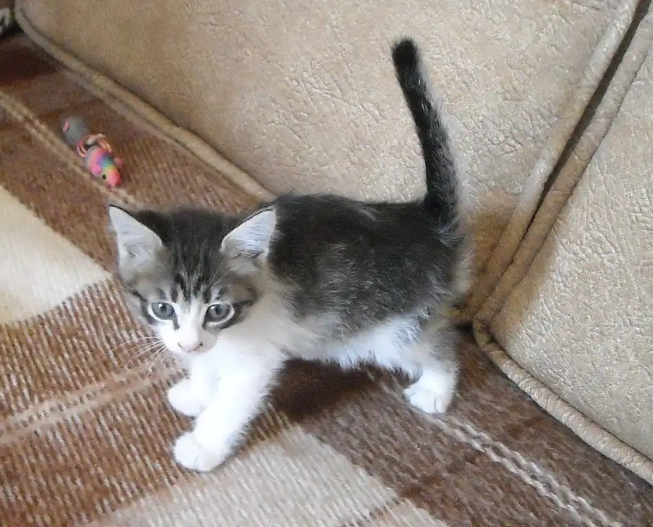 Котенок Майя, девочка, возраст 1,5-2 месяца. Беленькая, с очень уютными серо-полосатыми пятнышками и «монограммой» в виде буквы «М». Малышку подбросили в подъезд в доме, где много собак. Была очень напугана, в страхе из последних сил вскарабкалась до последнего этажа, но там в квартире тоже живет собака, которая и обнаружила Майю при вечерней прогулке. Малютка храбро встретила опасность лицом к лицу... смело, насколько могла, делала устрашающий вид. Ветеринаром осмотрена, здорова. Поставили витаминчик, все профилактические мероприятия проведены. Малютка активная, игривая, очень умная! Любознательная, всем интересуется, несмотря на перенесенный стресс. В качестве самой любимой игрушки выбрала обыкновенную серую мышку, наверное, совершенствует навыки охраны хозяйского добра! Ходит в импровизированный лоточек. Доставка. Имеет скидку на стерилизацию. Тел.: 8-962-781-6241, 55-39-73, тел. для смс: 8-909-548-4033