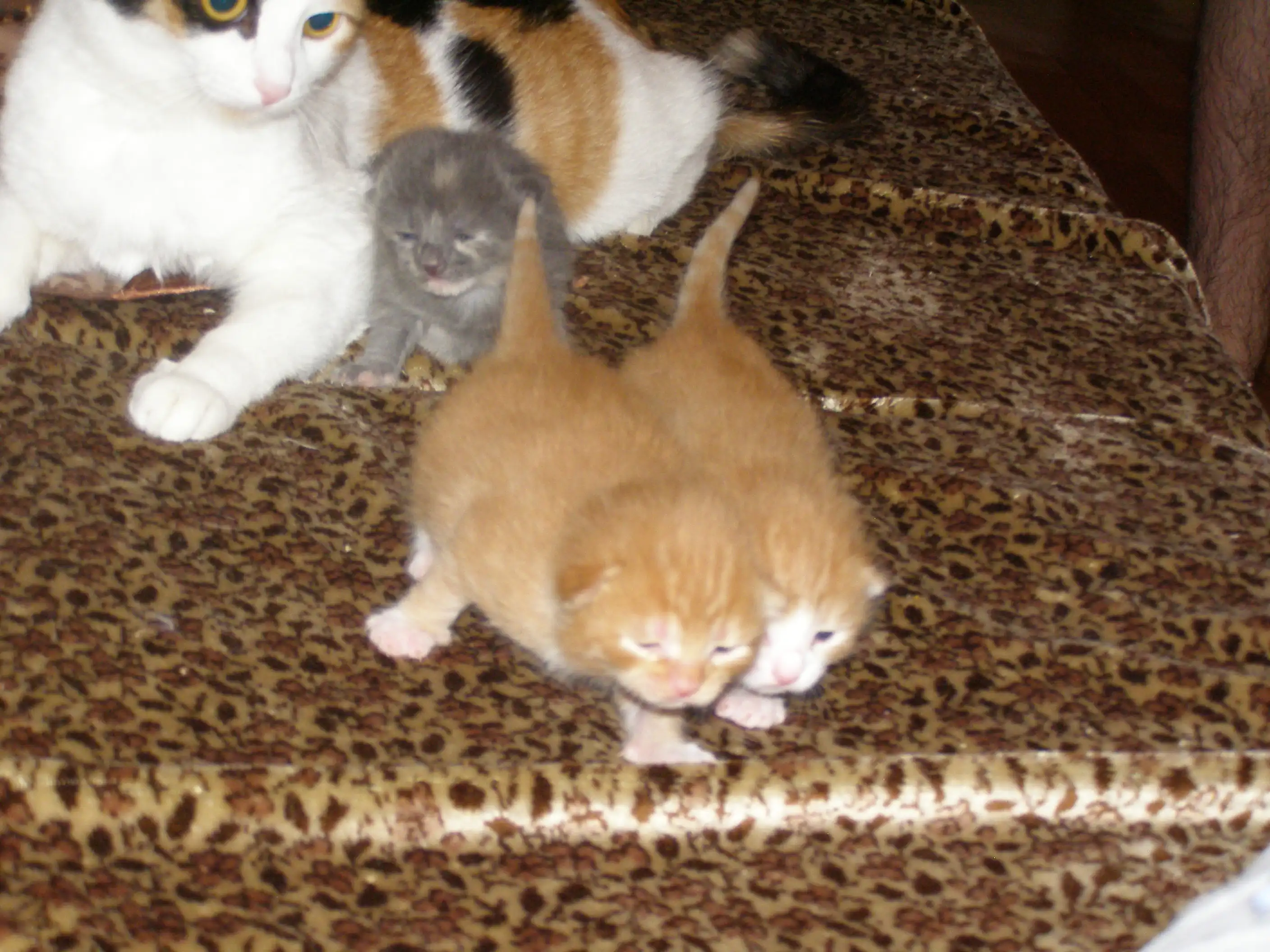 Отдам трех беспородных котят: 2 рыжих полосатых мальчика и серую девочку. Возраст: 2 недели. Котята от нашей домашней кошки. Ласковые, общительные и активные. К туалету пока не приучали, т.к. они совсем маленькие, пока их кормит мама, они еще не умеют ходить. Кличек не давали.