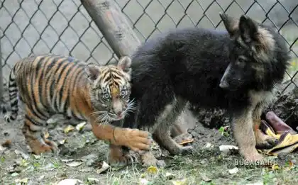 Трехмесячный тигрёнок Зоя была брошена собственной матерью. На фото она играет со своей ровесницей Фридой в Варшавском Зоопарке. Хозяин Фриды – работник зоопарка, временно поселил щенка с Зоей, чтобы маленькой рыжей сироте было не так одиноко.