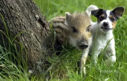 Пятинедельный кабан Мэнни любит играть с джек рассел терьером Кэнди в Эхрингаузене, Германия. Мэнни, которого нашли брошенным в лесу, теперь живет у людей.