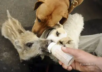 Кабанчик по кличке Шницель соображает на троих бутылку молока с двумя собаками в Виблингверде, Германия. Шницель отбился от стада диких кабанов, которые влезли в сад приятеля фермера Хейко Кордта. Хейко помогал другу прогнать кабанов, и теперь воспитывает Шницеля вместе с пятью своими собаками.