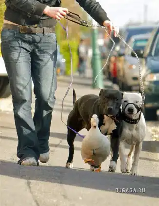 Утка Эсси на прогулке с ее стаффордширскими друзьями Рашкой и Диди в Борнмуте, Англия.