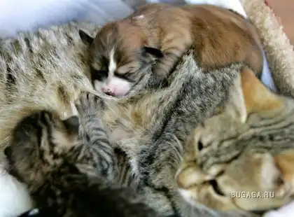 Кошка Смайгель нянчит своих котят и еще четырех щенят впридачу в доме ее владельца Мохаммада Аль-Хаммури в Аммане, Иордания. Смайгель усыновила щенят после того как их мама погибла под колесами автомобиля.