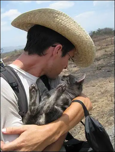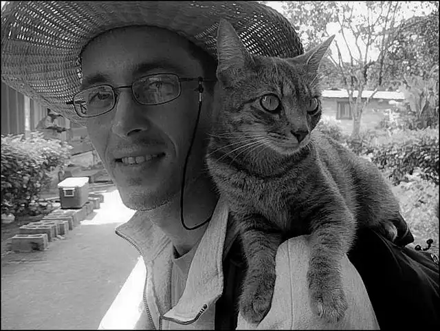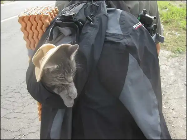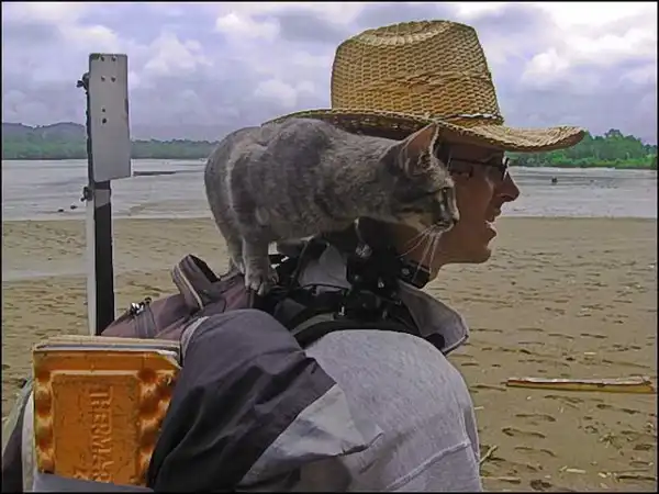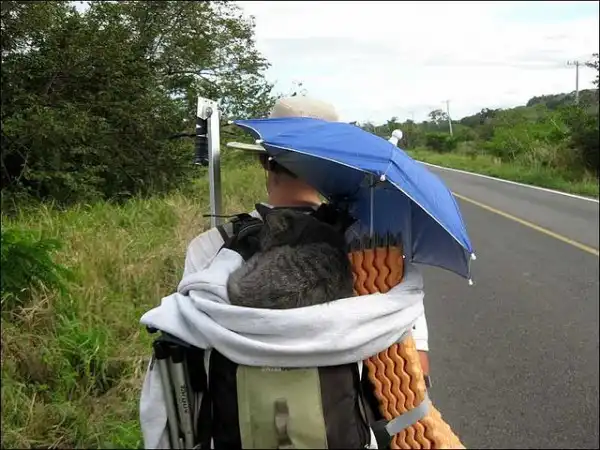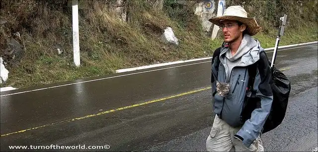 Компанию путешественникам-авантюристам составляет их кошечка Китти, которая была случайно найдена парой на обочине шумной дороги в штате Луизиана. Она была такая крошечная и одинокая, что парочка решила помочь ей отыскать новый дом. Однако в скором времени мужчина и женщина так привязались к милому созданию, что решили оставить ее себе. Китти отвели к ветеринару, где проверили ее физическое состояние и сделали все необходимые прививки, так что малышка может продолжать путь без угрозы для здоровья. Поскольку французам по их визе разрешено находиться на территории США не более 85 дней, для достижения цели им приходится проходить порядка 30 километров в день. Кошечку Китти такое положение дел ничуть не смущает. Она любит путешествия не меньше, чем ее хозяева. Она часто залазит на плечо своего папочки, чтобы насладиться каким-нибудь новым пейзажем и без смущения знакомится с новыми людьми. Вероятно, Китти станет первой кошкой увидевшей почти половину земного шара.