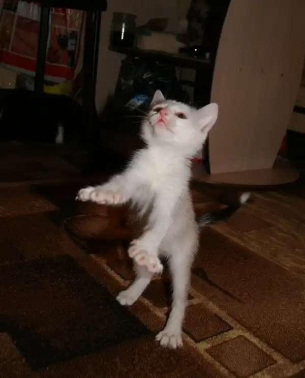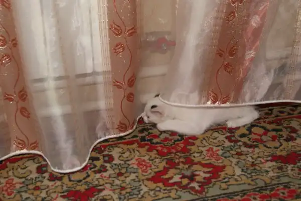 Балуется со шторками, сама себя развлекает. Кушает часто, надо еду предлагать, иначе сама пока не подойдет к чашке. О ней совсем не заботились.