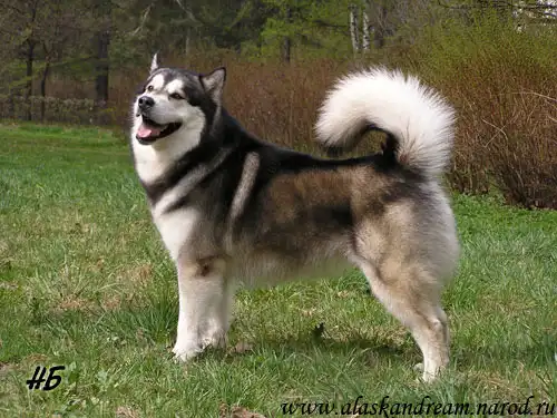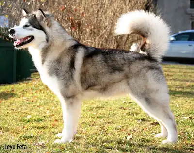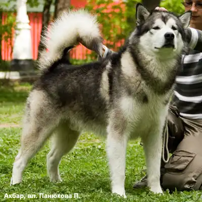 Маламут (Хорошо опушенный с более длинным волосом. Средне посажен. Напоминает опахало. В движении выше уровня спины. В стойке закинут на спину, но не закручен в кольцо и не прижат к спине).