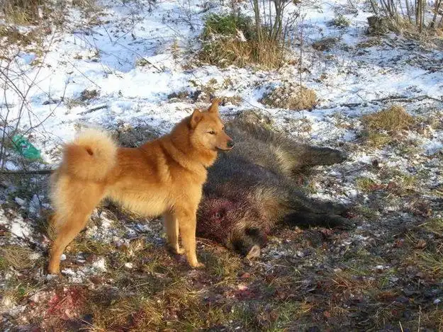 КАРЕЛО-ФИНСКАЯ ЛАЙКА. Охотничья собака лесной полосы северо-западной части России. Выведена на основе карельских и олонецких промысловых собак, с применением скрещивания с финской лайкой. Заводское разведение началось в 20-х годах XX века. С карело-финской лайкой охотятся на пушного зверя, боровую и водоплавающую птицу, а также медведя и копытных животных. В настоящее время распространена в основном в европейской части России. Первый стандарт принят в 1949 г.