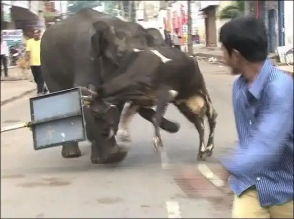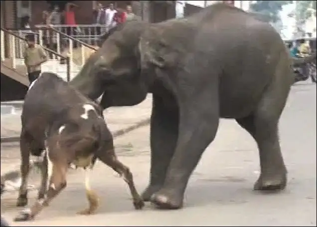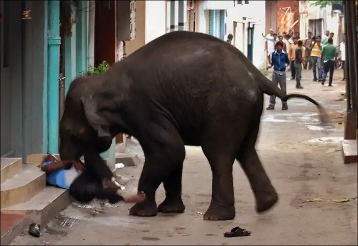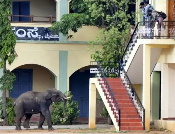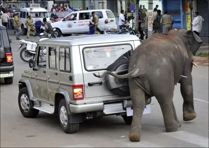 Сегодня утром в индийский город Майсур ворвались два диких слона. Животные были настроены очень агрессивно и нападали на все, что попадалось у них на пути, включая людей, автомобили и домашних животных.