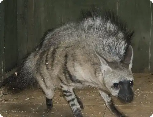 Это животное нередко путают с полосатой гиеной, так как внешне они схожи. Земляной волк (лат. Proteles cristatus) мельче настоящей гиены почти в 2 раза, причем существенной разницы между самцом и самкой нет. Длина тела составляет от 0,5 до 0,95 м, высота – до полуметра, длина хвоста 20-30 см.