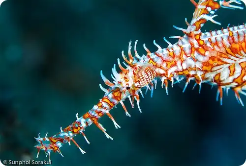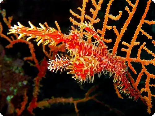 Трубокрылов арлекинов часто связывают с морскими иглами и коньками, хотя это отдельный самостоятельный вид, самый красивый в своем семействе.