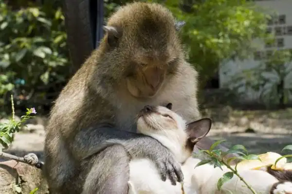 Обезьяна по кличке Мулан с таиландского острова Ко-Куд является большой любителницей кошек. По словам местным жителей, никто ее к этому не приучал, это ее личная инициатива. Кошки тоже посторонние. Она их сама где-то находит (почти каждый день новую) и потом с ними возится, обнимает, ловит блох. И заставить отпустить их может только любимый йогурт