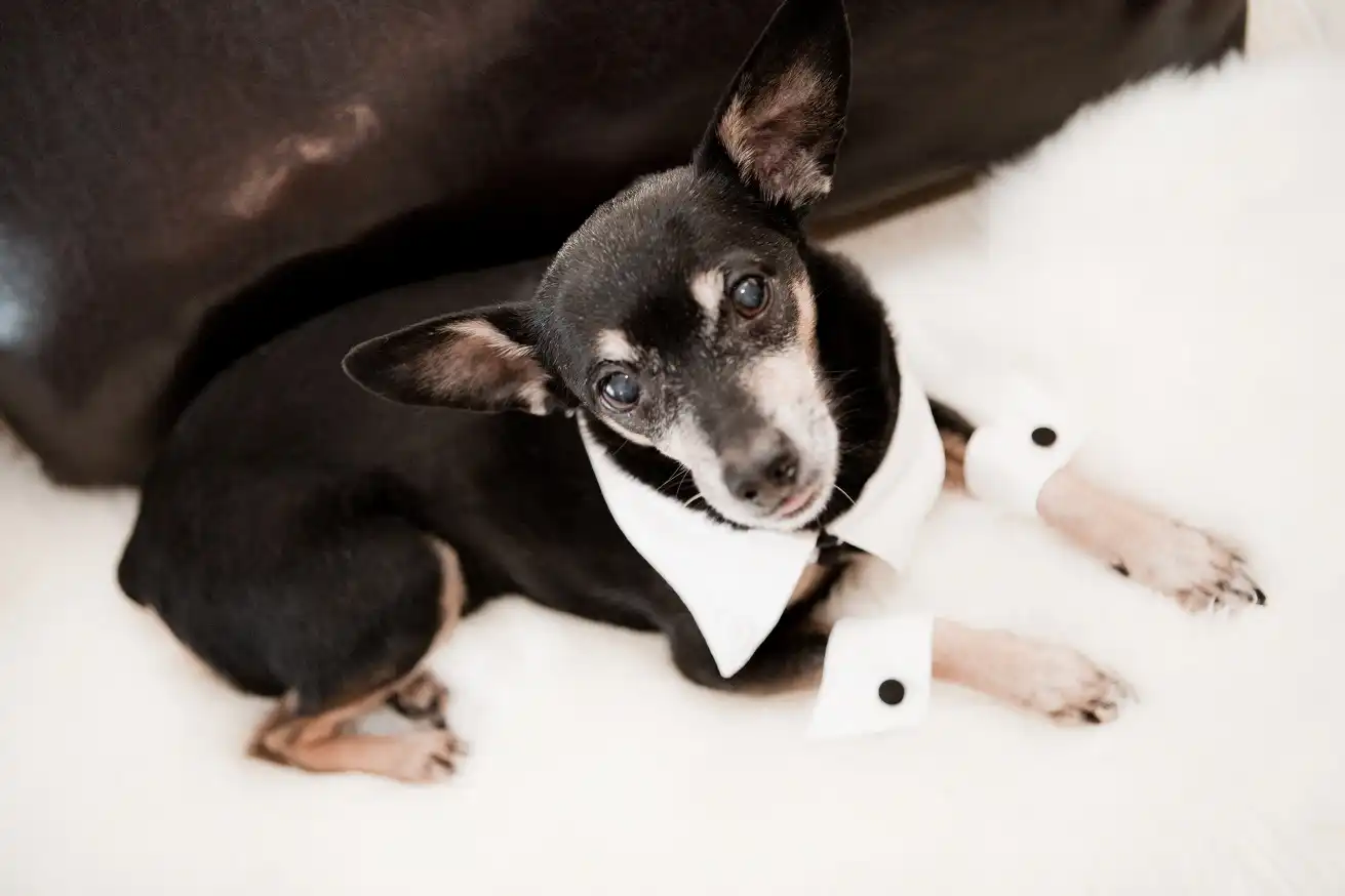 Порода малый пинчер, 16 лет. Окрас черный с подпаленами, седой подбородок, на груди белый "галстук".