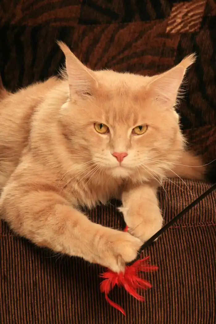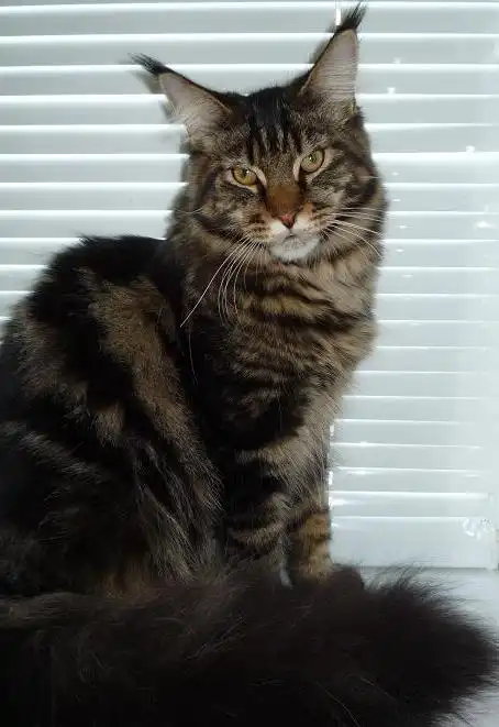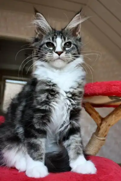 Мейн - кун выглядит действительно как лесная кошка: густая шерсть, кисточки на ушах, толстые лапы - с пучками шерсти между пальцами, пушистый хвост и дикое выражение морды. При всем этом, мэйнкуны имеют потрясающий характер. Эти большие кошки очень привязываются к хозяевам, любят помогать во всех делах, но никогда не навязывают своего общества. Кошки мейн кун любят играть и выполнять различные трюки и имеют приятный, тихий, щебечущий голос. Мэйн - куны абсолютно покладисты и в городской квартире доставляют минимум неудобств. Они быстро запоминают правила поведения и не нуждаются в особом уходе.