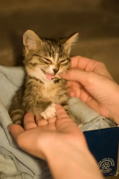 В мой подъезд подкинули крошечного котёнка. Возраст – около месяца(+/-).