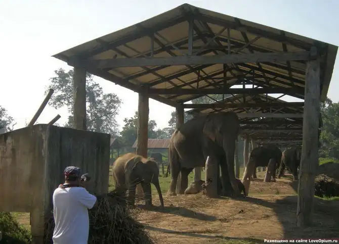 Слоны любят только свежую, сочную траву, так что ходить в джунгли за ней приходится часто. А всю траву, которая осталась не съеденной, сжигают. Трава же эта весьма сильно дымит при горении. Настолько сильно, что этого хватает, чтоб окутать густым дымом весь поселок (а это сотни жилых домов), тем самым, защитив его от ненасытных москитов, которые не дают спокойно жить всем обитателям данного региона — и людям, и животным.