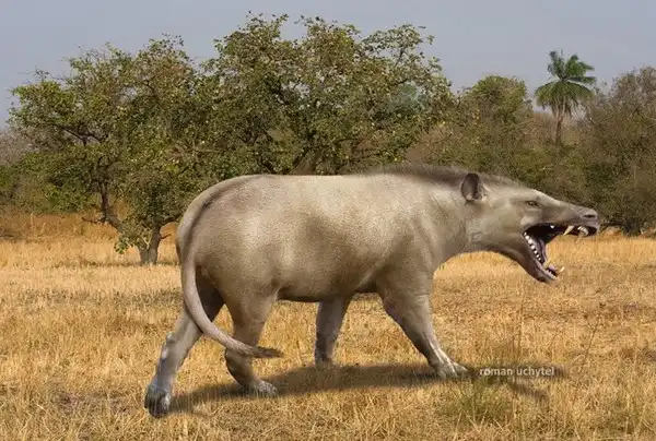 Деодон (Daeodon) - азиатский энтелодонт, мигрировавший в Северную Америку примерно в конце олигоценовой эпохи (20млн. л.н.). "Гигантские свиньи" или "свиноволки" были четвероногими сухопутными всеядными, обладавшие массивными челюстями и зубами, которые позволяли им сокрушать и поедать крупных животных, включая кости. При росте более 2м в холке отбирал пищу у более мелких хищников.