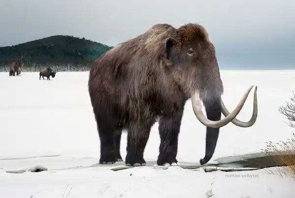 Шерстистый мамонт (Mammuthus primigenius) появился 300 тысяч лет назад в Сибири, откуда распространился в Северную Америку и Европу. Мамонт был покрыт грубой шерстью, длиной до 90 см. Слой жира толщиной почти 10 см служил дополнительной теплоизоляции. Летняя шерсть была существенно короче и менее плотной. Окрашены были скорее всего, в тёмно-коричневый либо черный цвет. С маленькими ушами и коротким по сравнению с современными слонами хоботом шерстистый мамонт был хорошо приспособлен к холодному климату. Шерстистые мамонты были не столь огромные, как часто предполагается. Взрослые самцы достигали высоты от 2,8 до 4 м, что не намного больше современных слонов. Тем не менее, они были значительно массивней слонов, достигая веса до 8 тонн. Заметное отличие от ныне живущих видов хоботных заключалось в сильно изогнутых бивнях, в особом наросте на верхней части черепа, высоком горбу и круто падающей задней части спины. Найденные до наших дней бивни достигали максимальной длины 4,2 м и веса 84 кг. В среднем, они составляли, однако, 2,5 м и весили 45 кг.