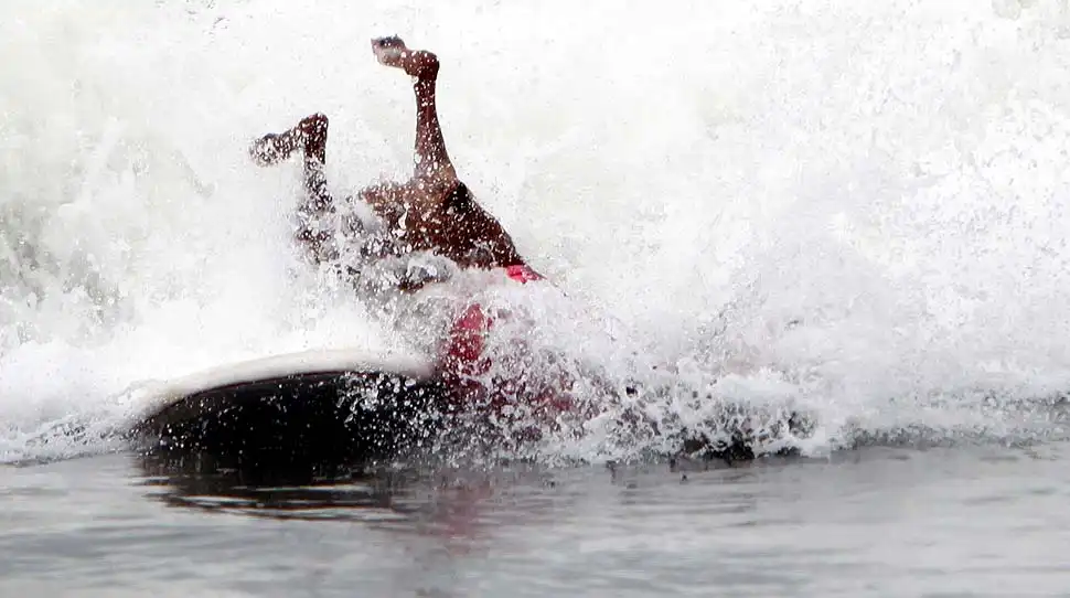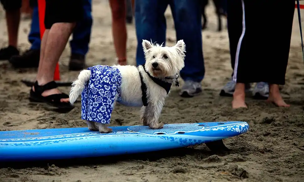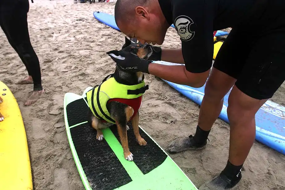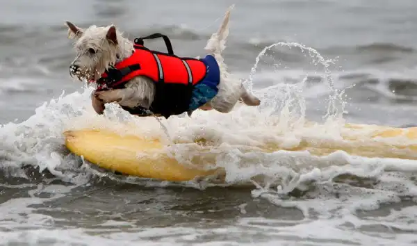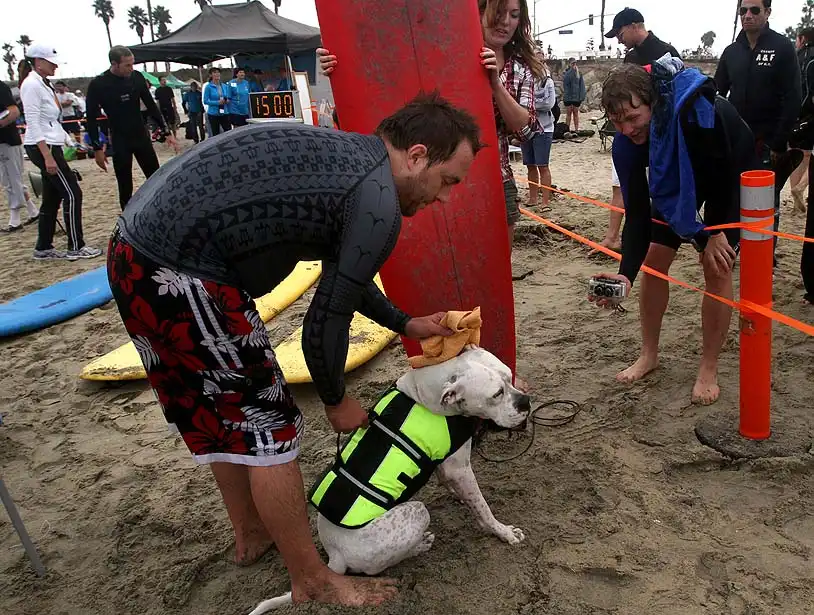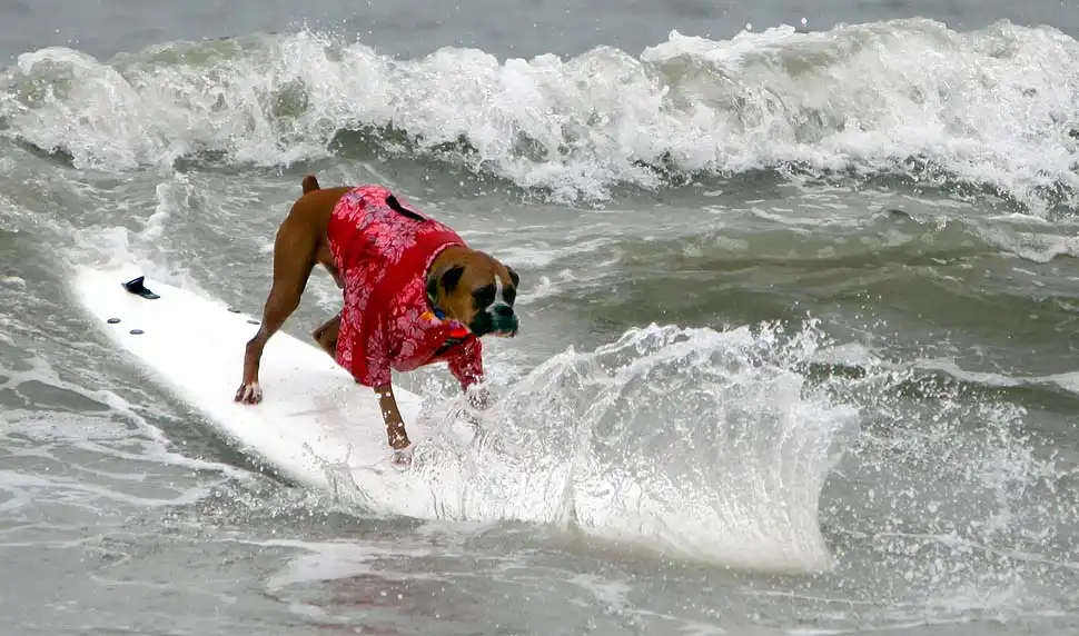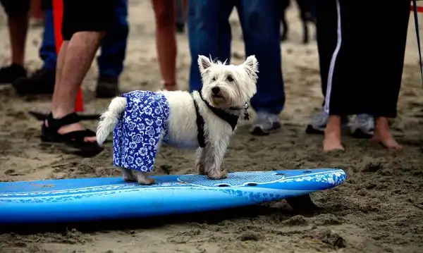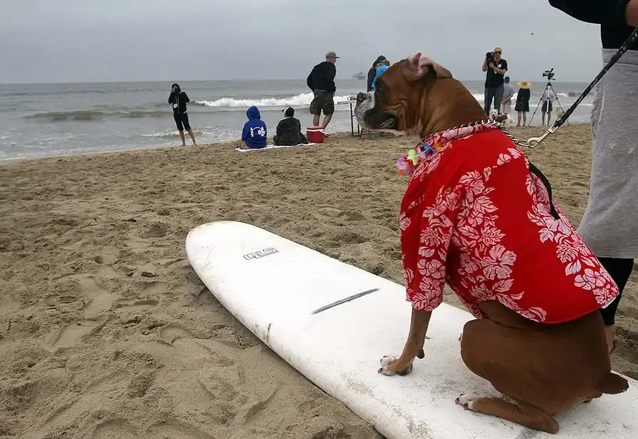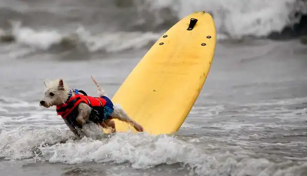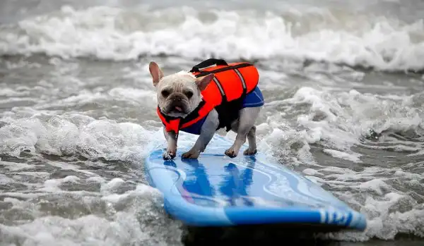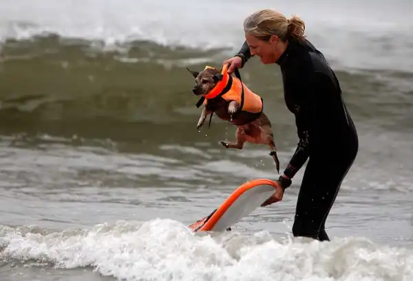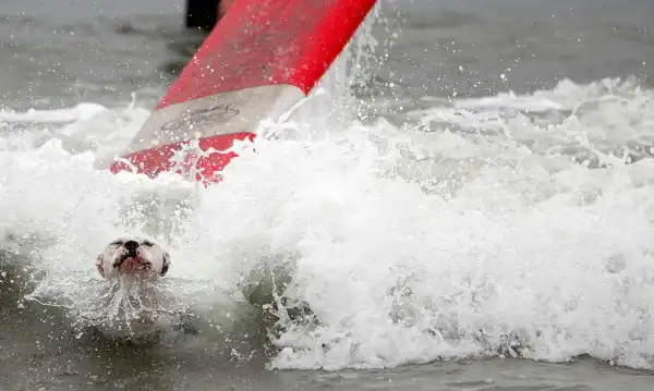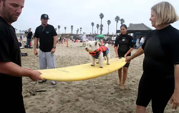 Около 20 собак участвовали в воскресенье в очередном соревновании по серфингу на пляже Хантингтон, в Лос-Анджелесе. Лабрадоры, боксеры, бульдоги, джек-рассел терьеры и другие породы собак – большие и маленькие – боролись за звание лучшего серфера на глазах многочисленных зрителей. Соревнование началось около 10 утра. У каждой собаки было минут 30-40, чтобы продемонстрировать свои умения. Их оценивали по многобальной шкале. Главной целью, конечно, было оставаться на доске и доплыть до берега. Делать это стоя на четырех лапах было куда труднее, чем лежа на доске. А катание задом наперед или спасение ситуации награждалось еще большим количеством очков.