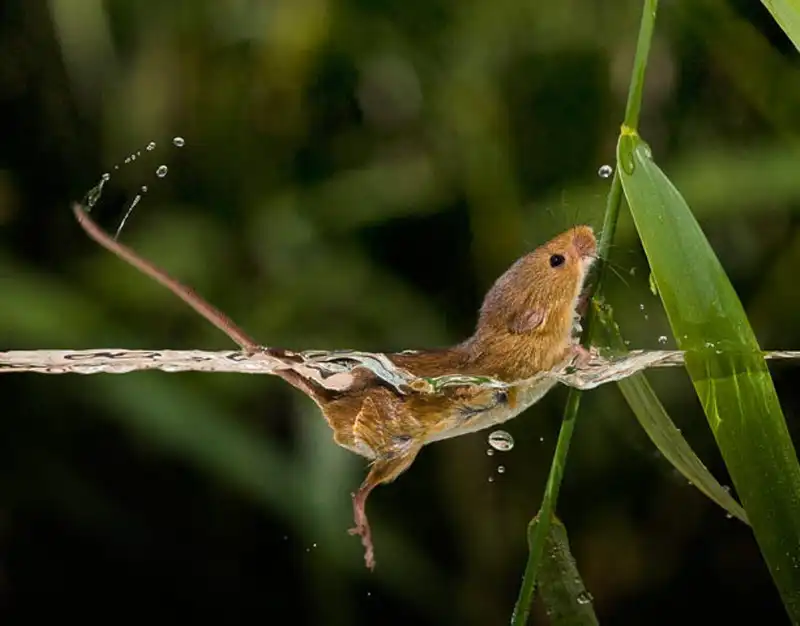 «Мы также хотели показать поведение этих животных во время материнства, но мы не могли подобраться к ним на воле, потому что боялись, что мама оставит детенышей. Вместо этого мы пофотографировали маму-мышку в студии, а потом отпустили их на волю, как только детеныши достаточно подросли». Чтобы продемонстрировать, как мышки перебираются через влажные участки полей и лугов, 55-летний Жан-Луи и 46-летняя Мари-Льюс пустили одну из мышек в плавание в небольшом аквариуме.