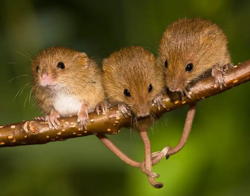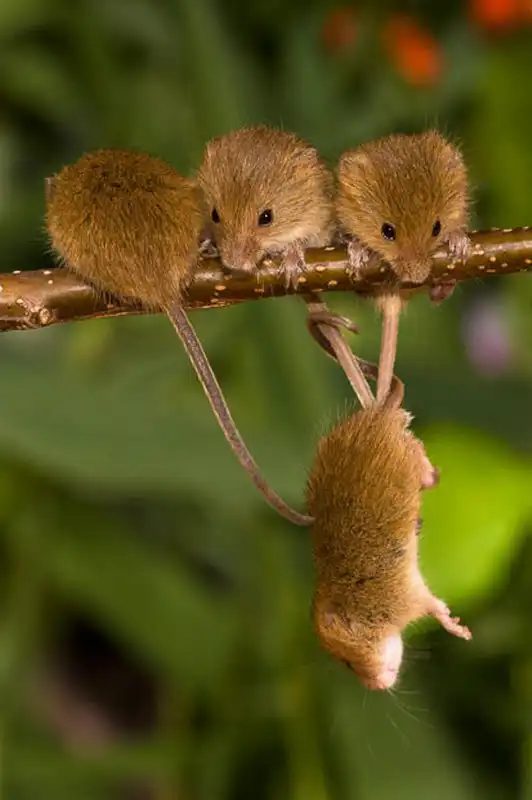 Три юных мышки-малютки сцепили хвосты, сидя на ветке…