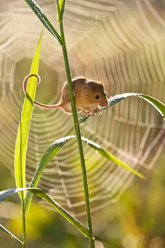 Самец мышки-малютки на канареечнике на фоне паутины.