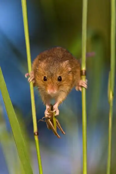Мышка-малютка балансирует между двумя травинками, держа в лапках кузнечика.