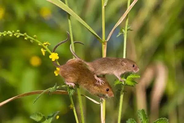 Мышь-малютка балансирует между двумя травинками в поле в Эльзасе.