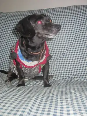 Марфа. Маленькая собачка, в роду похоже были таксы. Бедняжка осталась на улице покалеченной, в следствие травмы неправильно срослись косточки и она осталась на трех лапах. Но это совершенно не мешает ей резвиться и радоваться жизни.