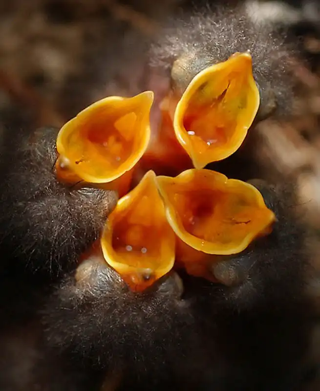 Голодные птенцы пересмешника, родившиеся менее суток назад, просят еду в гнезде недалеко от гольф-поля в Батон Руж, штат Луизиана. Пересмешники обычно вьют гнезда недалеко от земли и откладывают от 3 до 5 яиц, которые вылупляются через 2 недели. Период гнездования длится с апреля по сентябрь. (AP Photo/The Advocate, Kerry Maloney)