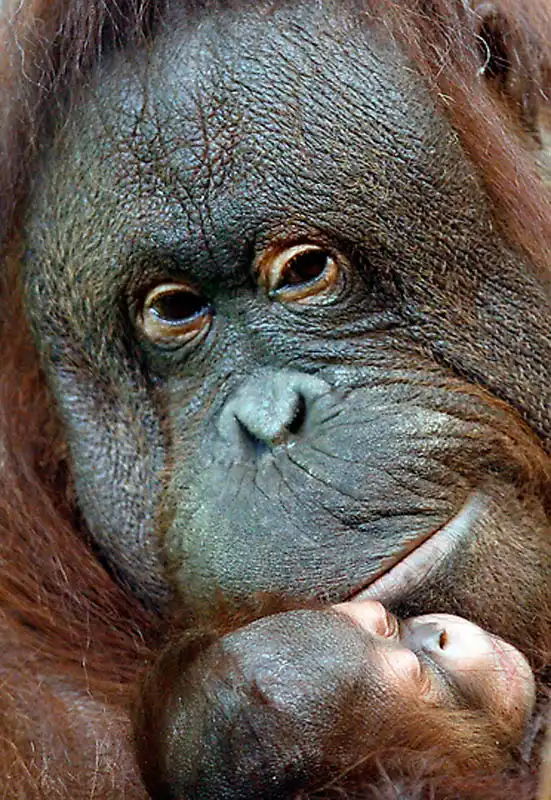 Двухнедельный детеныш орангутанга по имени Изни (слева) со своей мамой Сарикей в зоопарке Честера. Изни – первый детеныш орангутанга, родившийся в зоопарке за 10 лет. В зоопарке живут более 7 тысяч животных и 400 разных видов, включая некоторые очень редкие. (AP Photo/Paul Thomas)