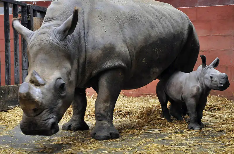 Детеныш белого носорога по кличке Кейя весом 30 кг со своей мамой в зоопарке Эрмиваль-ле-Во. Рождение белых носорогов в неволе – случай редкий, в Европе таких всего 1-2 в год. (MYCHELE DANIAU/AFP/Getty Images)